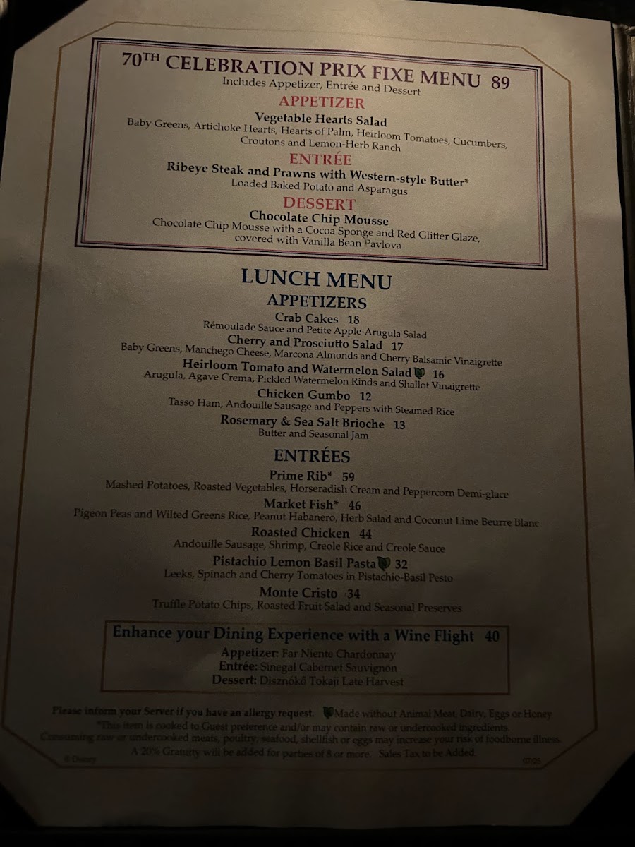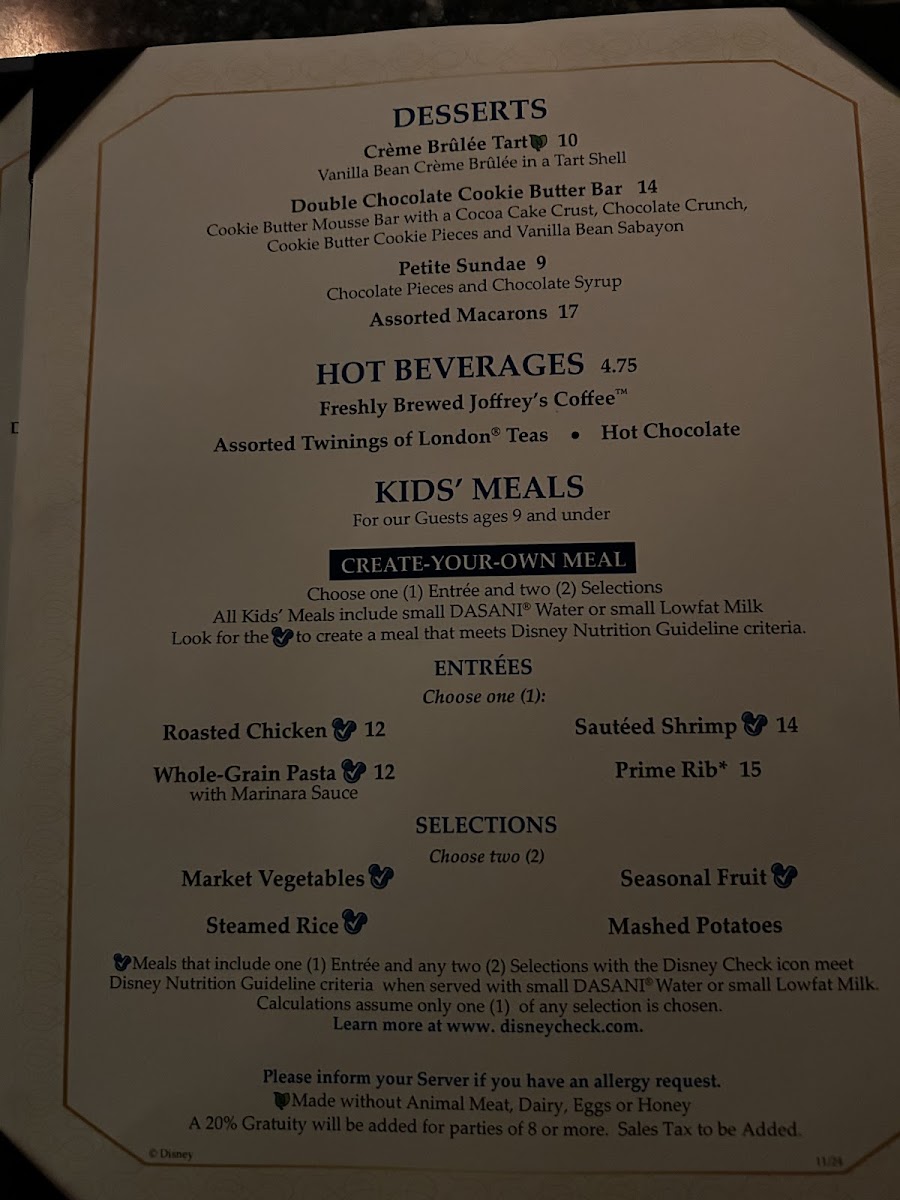 Served with Choice of Two (2) Selections and choice of Small Low-fat Milk or Small DASANI® Water. Meets Disney Nutritional Guidelines for Complete Meals without substitutions (For Gluten/Wheat, Egg, Fish, Milk, Peanut/Tree Nut, Sesame and Soy Alle...