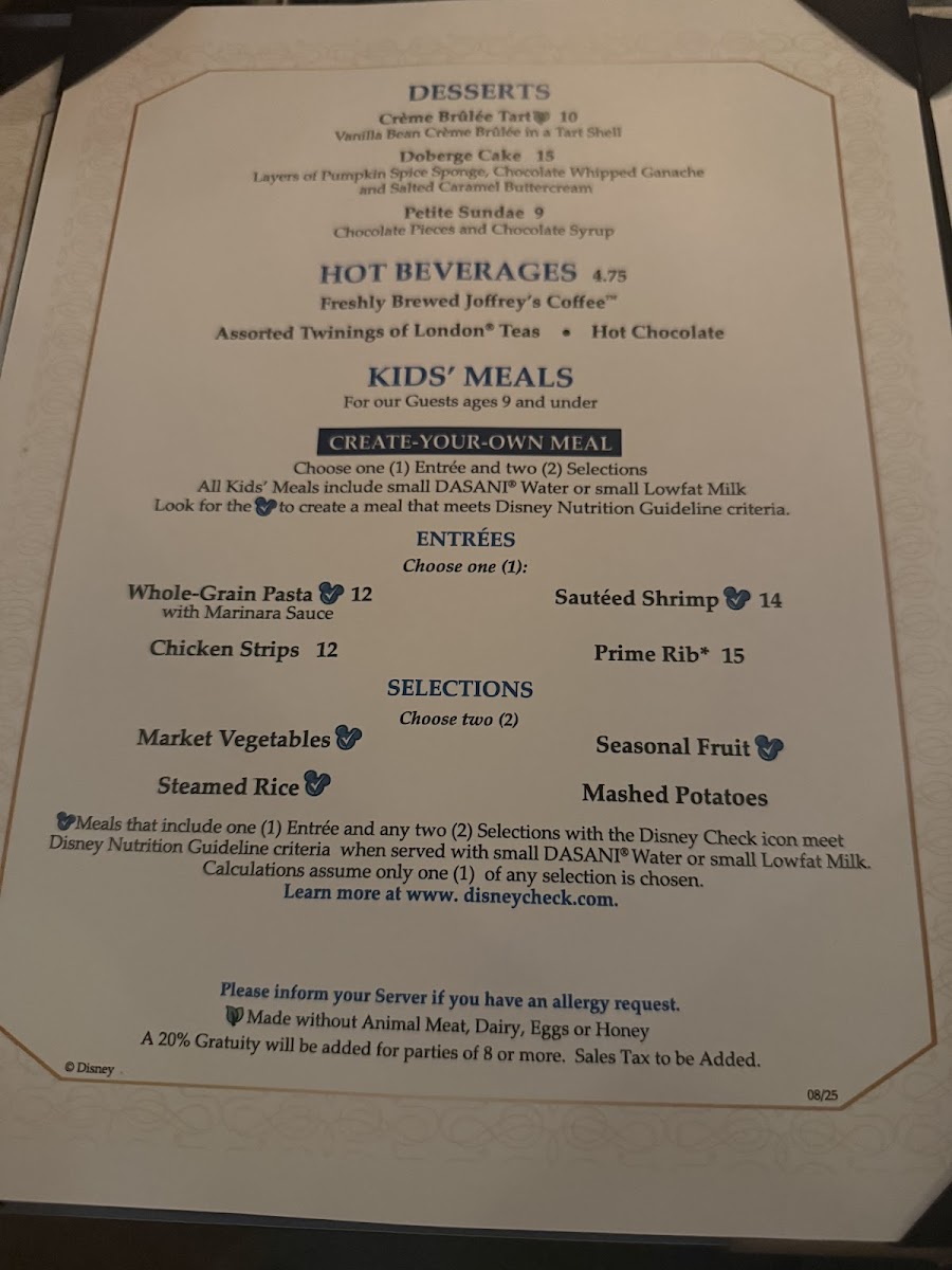 served with Choice of Two (2) Selections and choice of Small Low-fat Milk or Small DASANI® Water. Meets Disney Nutrition Guidelines for Complete Meals without substitutions